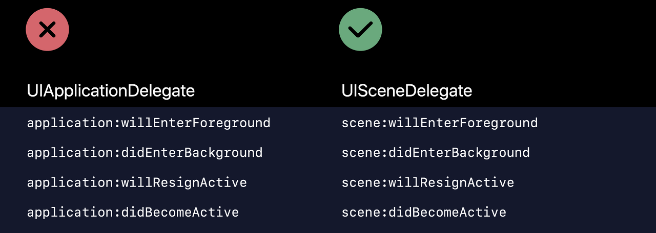 이제 화면이 백그라운드로 가거나 포그라운드로 돌아올 때 등 화면 상태에 관한 이벤트 처리를 SceneDelegate가 하게 됩니다.