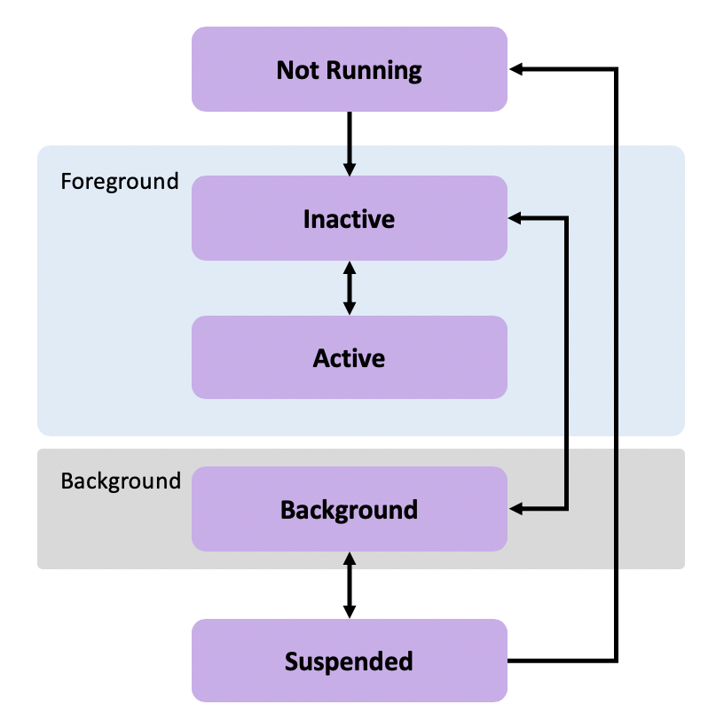 | In-active(비활성화) | 앱이 실행되면서 포어그라운드에 진입하지만 어떠한 이벤트도 받지 않는 상태입니다. |