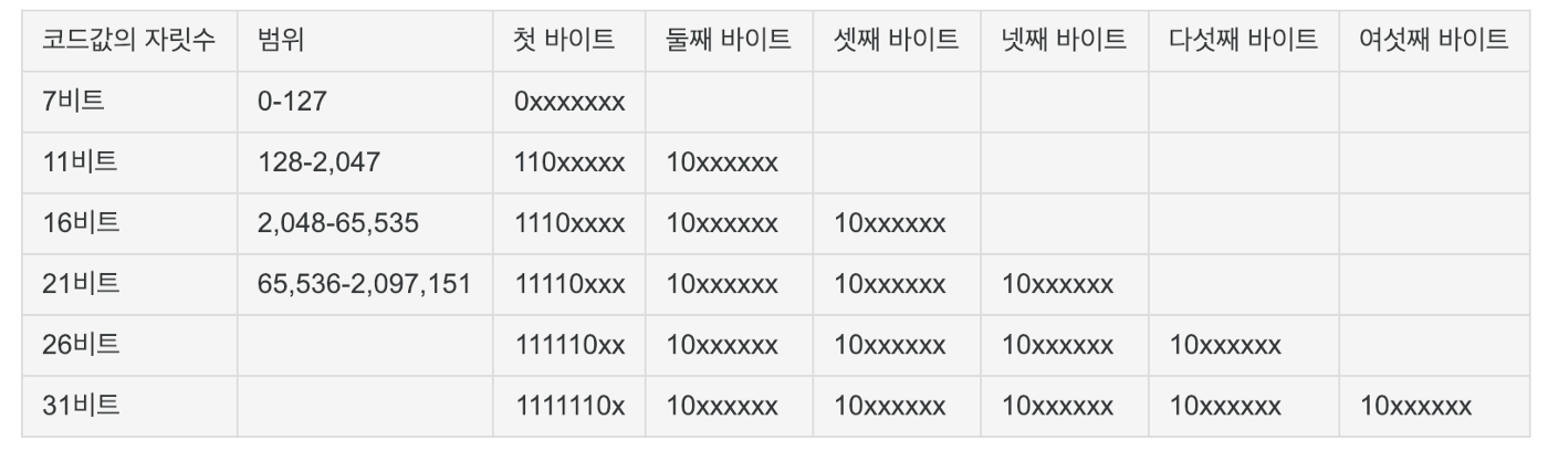 가변 인코딩이란 글자마다 byte 길이가 다르다는 뜻입니다. 영어는 1바이트, 한글은 3바이트로 인코딩 하게 됩니다.