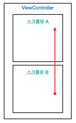 어쩐지 위에 처럼 스크롤뷰 2개가 있을 때 B -> A 쪽으로 스크롤 해도 B에만 이벤트가 전달 되더라구요. 스크롤 할 때 A 지역으로 넘어 갔지만 UITouch는 B 객체로 계속 재사용 되는 거였네요. 😗