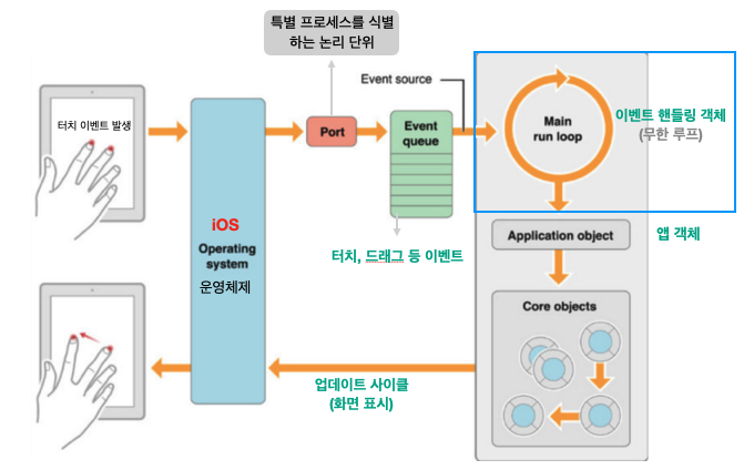 - Event queue에 쌓인 이벤트를 Main run loop가 처리하여 앱 객체에게 전달해줍니다.