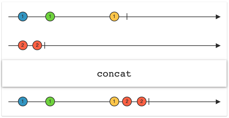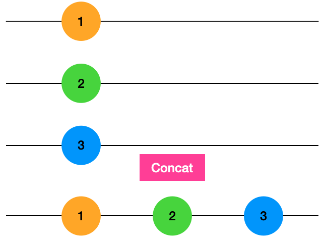 위의 코드를 그림으로 그려보면 Observable 타입 3개가 있고 concat으로 결합하고 한개씩 출력하게 됩니다.