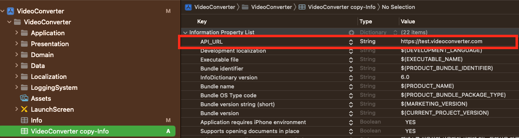 Dev용 info.plist에 API_URL 을 추가해 줍니다.