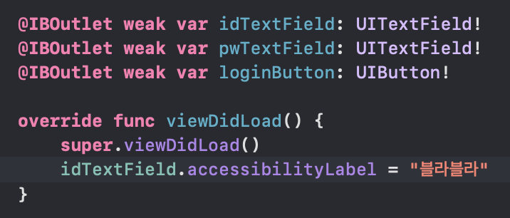| Identifier만 'loginButton'로 적어주었을 때 | '로그인'으로 읽어줌 | app.buttons["loginButton"].tap() |
