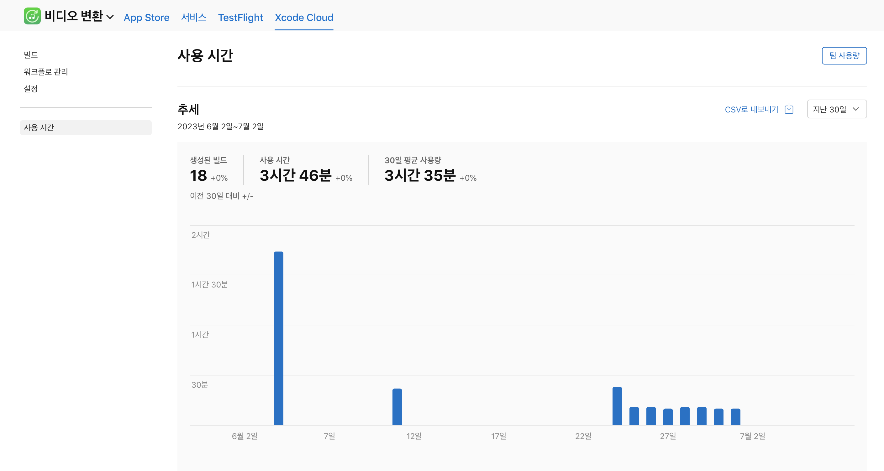 물론 xcode cloud 시작 주기를 어떻게 설정하느냐에 다르겠지만요!! 15분마다 돌아가게 한다면 25시간이 넘을 수도..