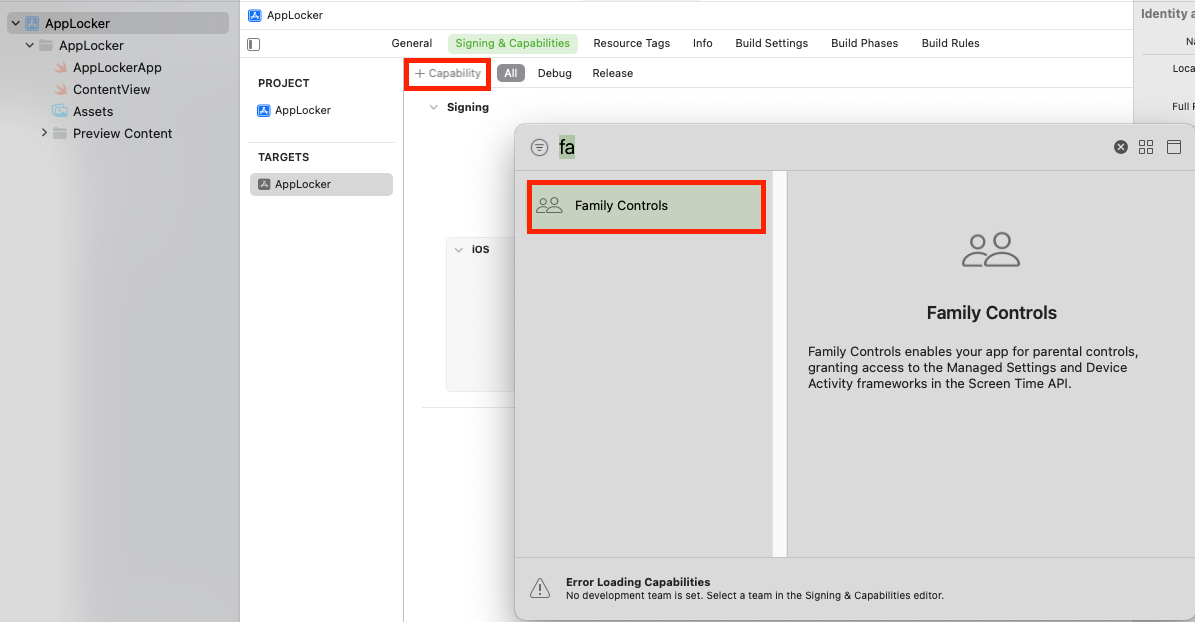 Family Controls를 추가 후 apple에서 스크린타임 권한 허용을 묻는 팝업 코드를 추가해 주시면 됩니다.