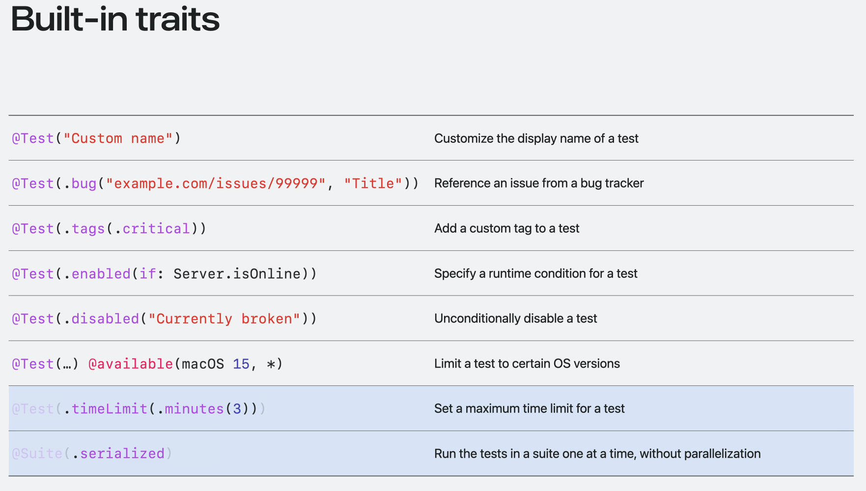 | Supports traits (테스트 함수 설명 달기) | No | Yes |