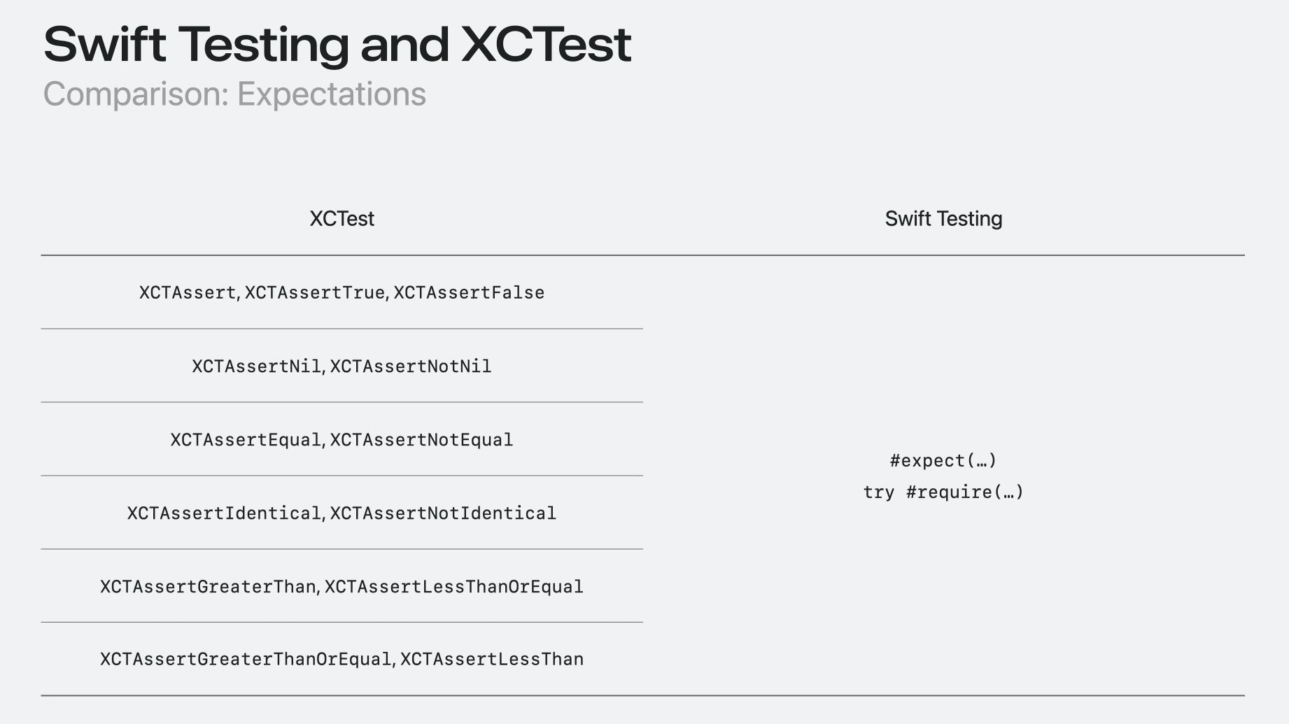 Swift Testing 에서는 #expect, #require 단 두개로 XCTest의 expectations을 다 커버합니다. 👍